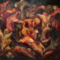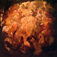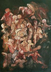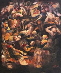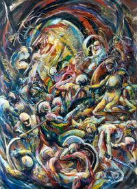 The paintings possess their own narrative, their own story, both ancient and contemporary; humankind is depicted in motion, evolving, alternating between struggle and defense; it yearns to transform itself by transporting itself to different and better realities, where it no longer needs to avoid its fellow human beings, but rather finds the spirit to unite with them and become one with them.