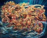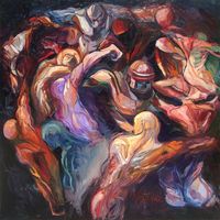 The paintings possess their own narrative, their own story, both ancient and contemporary; humankind is depicted in motion, evolving, alternating between struggle and defense; it yearns to transform itself by transporting itself to different and better realities, where it no longer needs to avoid its fellow human beings, but rather finds the spirit to unite with them and become one with them.