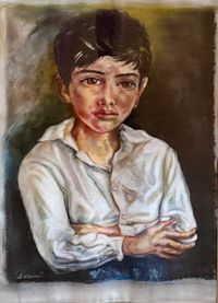 The vertical format (55 x 36 cm) stylizes the figure and focuses attention on the child's face. The white shirt, treated with delicate variations of light and shadow, acts as a compositional axis and a symbolic element of purity and innocence.